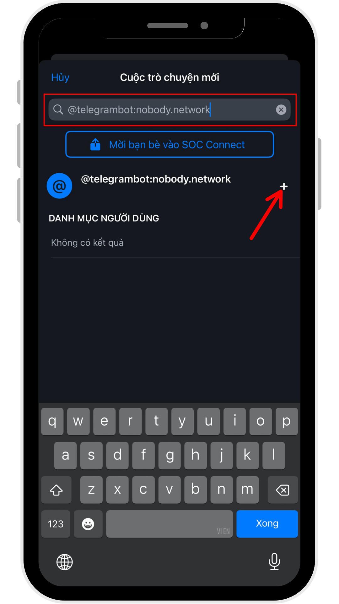 3️⃣ Nhập “@telegrambot” kèm theo dấu hai chấm và thông tin địa chỉ máy chủ của bạn vào ô tìm kiếm, rồi bấm dấu cộng.